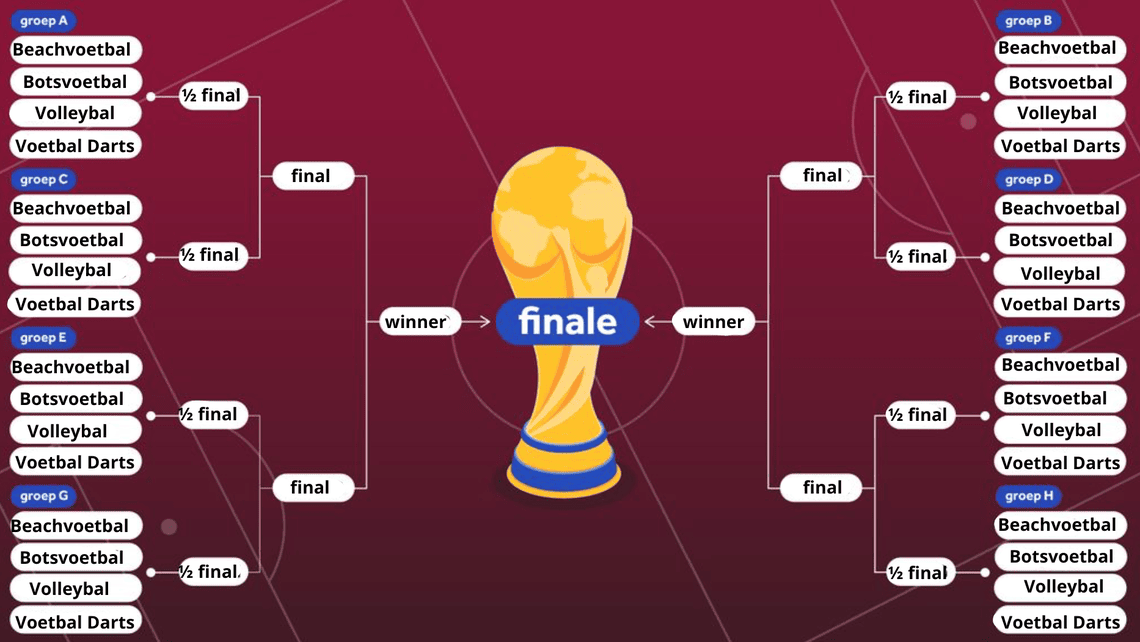 Het hart van de dag. Teams spelen tegen elkaar in een echte groepsfase, met knock-outrondes en een finale. De sfeer is fanatiek, maar toegankelijk. Perfect om collega’s op een andere manier te leren kennen.